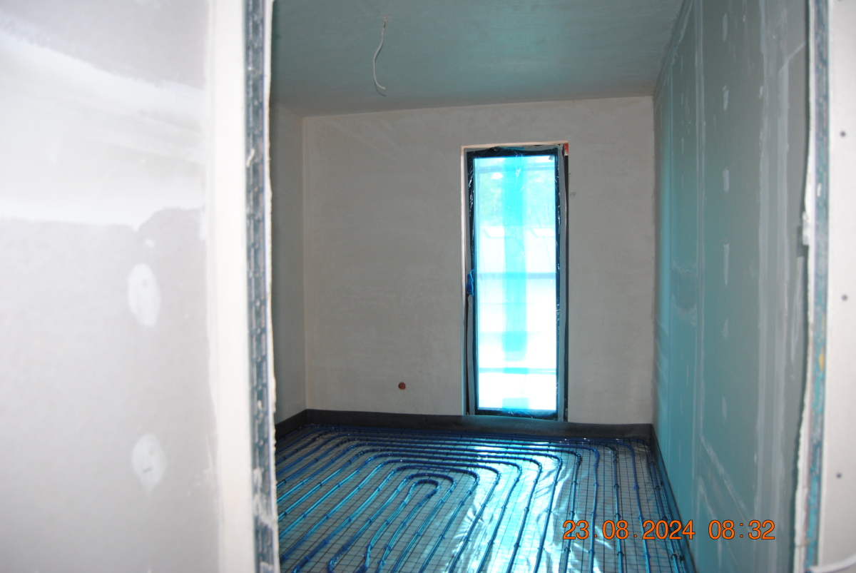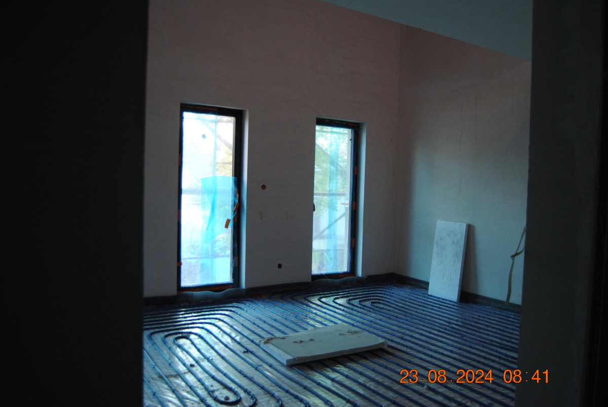 We wszystkich mieszkaniach położono już spirale grzewcze do ogrzewania podłogowego. Przypomnijmy, że ogrzewanie będzie zasilane pompą ciepła. Ogrzewanie podłogowe jest najbardziej komfortowym sposobem ogrzewania pomieszczeń, gdyż jako jedyne oferuje w pełni równomierne podgrzanie całej powierzchni lokalu. A kto się z nim zetknął - z pewnością potwierdzi, jak bardzo przyjemnie stąpa się po ciepłej podłodze, np. w łazience... :-)