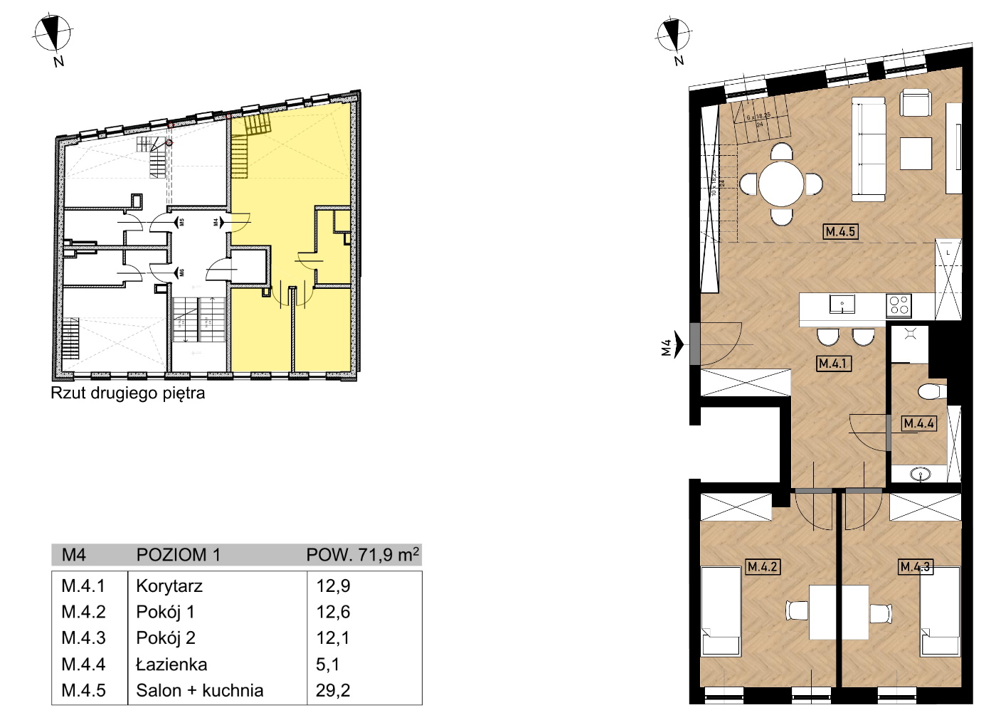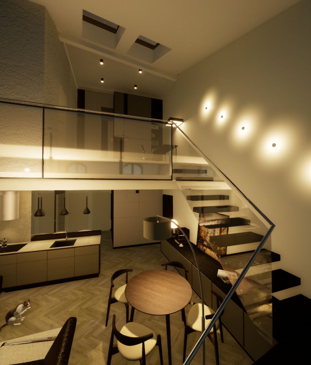 Dwupoziomowe mieszkania, o powierzchni ponad 111 m2, umiejscowione na drugim piętrze (poziom 1) i poddaszu (poziom 2) kamienicy Bytomska 20.